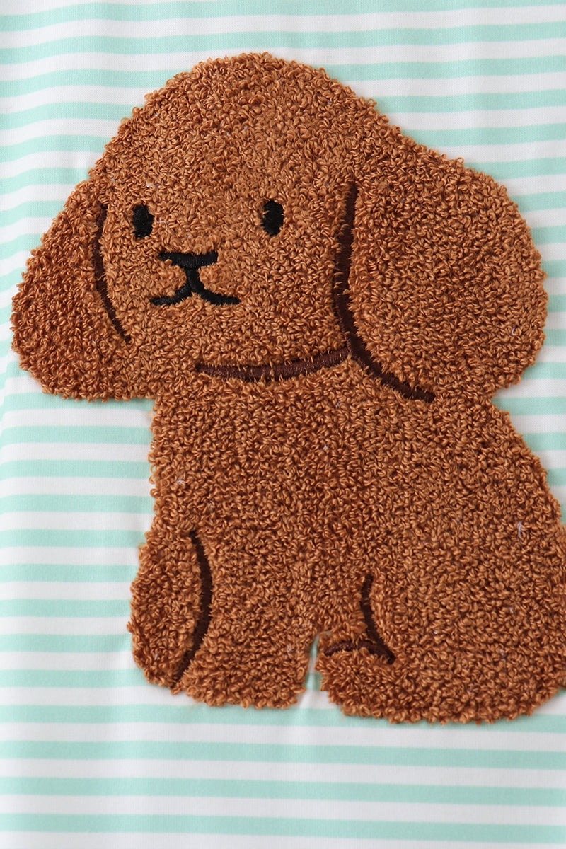 Adorable green striped shorts set featuring an adorable puppy design with charming French knot details. Perfect for little ones who love cute animal prints and playful style. The soft, comfortable fabric makes it ideal for everyday wear, playdates, or casual outings. This delightful set combines fun fashion with quality craftsmanship, giving your child a wardrobe piece that's as sweet as it is stylish. A must-have for puppy lovers everywhere!