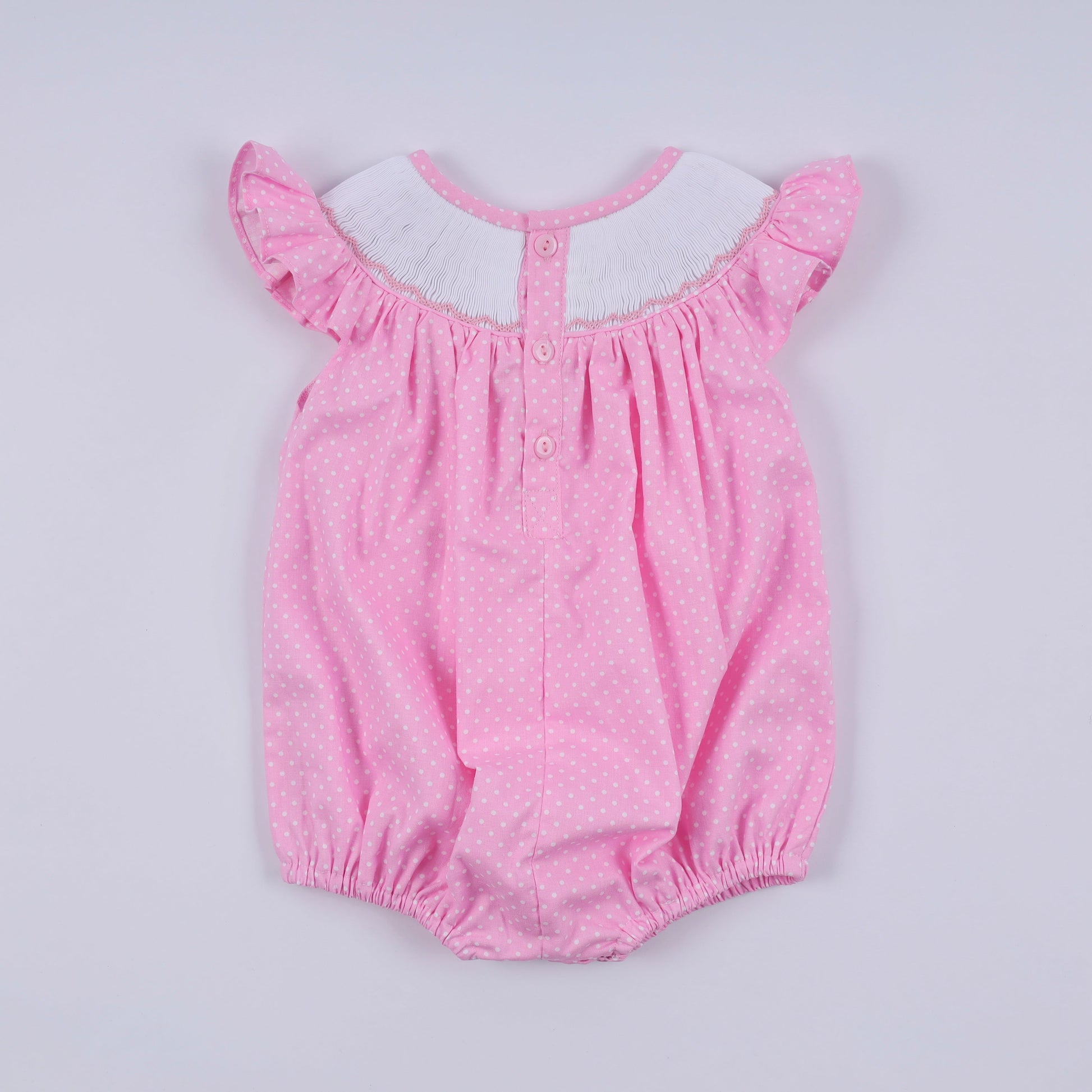 Adorable bubble romper featuring hand-smocked detailing with charming character motifs and delicate dot patterns. Soft ruffled trim adds a whimsical touch perfect for little ones. The smocked bodice provides a comfortable fit while the playful design brings joy to any outfit. Ideal for playdates, special occasions, or everyday adventures. Crafted with care for your child's comfort and style.